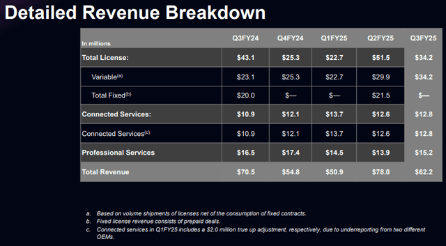The company generates most revenue through high-margin license revenues, which usually have a one-time fixed, as well as a variable component. The fixed payments are one-off, so they create lumpiness in q/q revenue: