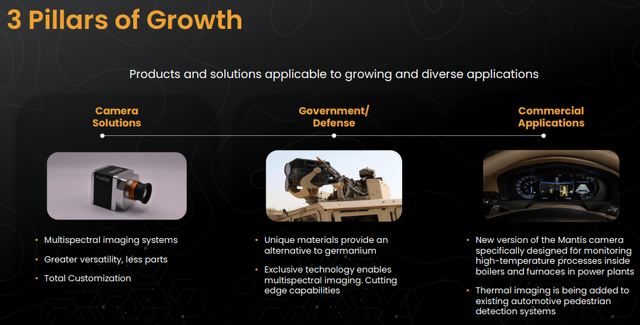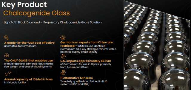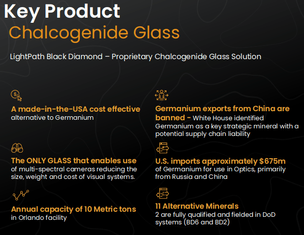 The company manufactures its own chalcogenide glass, including the proprietary BlackDiamond material is the only glass that enables true multi-spectral imaging, while also reducing the size, weight, and cost of infrared systems and as importantly, replacing Germanium which has a considerable supply chain risks given that most of it comes from Russia and China with the latter already having placed restrictions on exports.