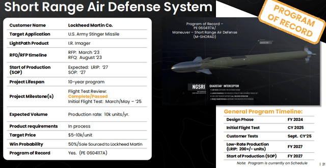 The NGSRI Program (Next Generation Short Range Interceptor - Stinger missile replacement) with Lockheed Martin. LightPath is developing a new camera system for Lockheed Martin that will be part of a missile system. This program is on an accelerated timeline, and the company has already achieved airworthy qualification of its subsystem.