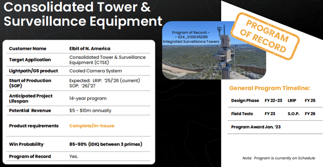 The Border Security Programs: G5 has additional large programs in border security. G5 is the sole provider for Elbit of America, one of three record suppliers for Border Patrol's towers. Elbit's system is considered the preferred system, and LightPath expects the majority of purchases to go through Elbit to G5. While an Indefinite Delivery/Indefinite Quantity (ID/IQ) contract, the first multi-million dollar order from Elbit was received in January, with real deliveries expected to start in the coming months.
