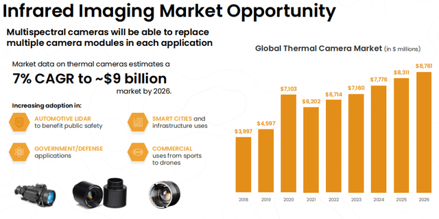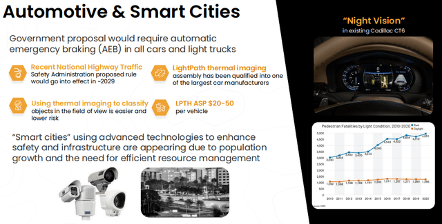 In Automotive, its thermal imaging assemblies have been qualified for mass production with automotive manufacturers, including advanced night vision technology already in use in vehicles such as the Cadillac CT6. Thermal imaging provides object detection and automated emergency braking, aligning with new federal safety proposals that may require such technology by 2029. Average selling price per vehicle is expected at $20–$50, with current shipping volumes exceeding 100K units.