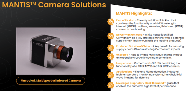 LightPath is also investing in increasing manufacturing capacity for its BlackDiamond materials with financial help from the DoD, as well as in the development of its camera technologies, like the Mantis and the new Optical Gas Imaging Camera platform.